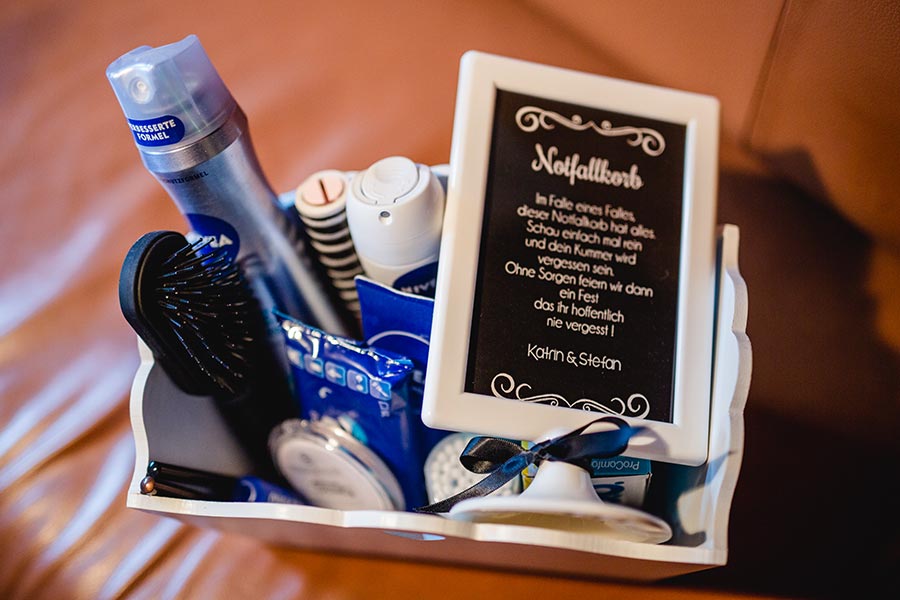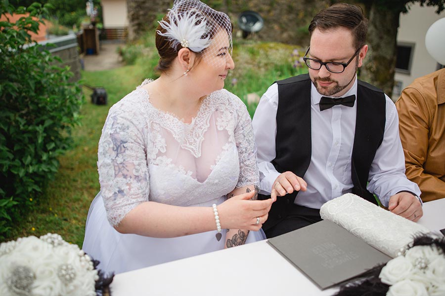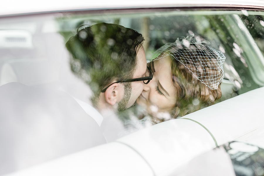 Vor der Trauung ging es zunächst für Katrin und Stefan zusammen mit Fotografin Frau Vau zum Paarshooting. Auf den Fotos springt sofort der hübsche Fascinator von Katrin und die Hosenträger von Stefan ins Auge – passend zum Rockabilly-Stil. Der Rockabilly-Stil zieht sich komplett durch die ganze Hochzeit der Beiden. So lässt sich dieser nicht nur bei der Kleidung beim Brautpaar wiederfinden, sondern auch beim Auto für das Brautpaar. Mit einem Cadillac Oldtimer ging es vom Fotoshooting hin zur Trauung unter freiem Himmel am Burgturm Kollnburg, natürlich mit Blechdosen hinten am Auto befestigt.