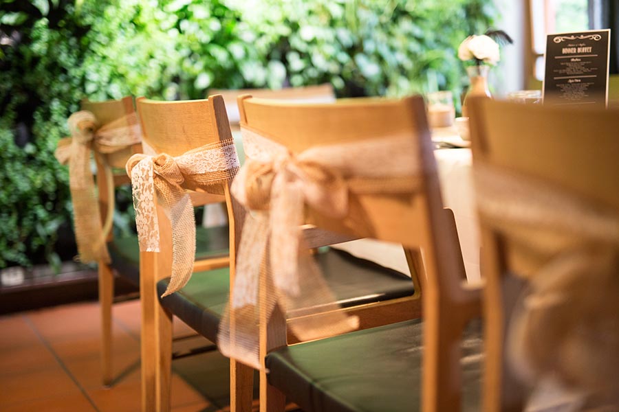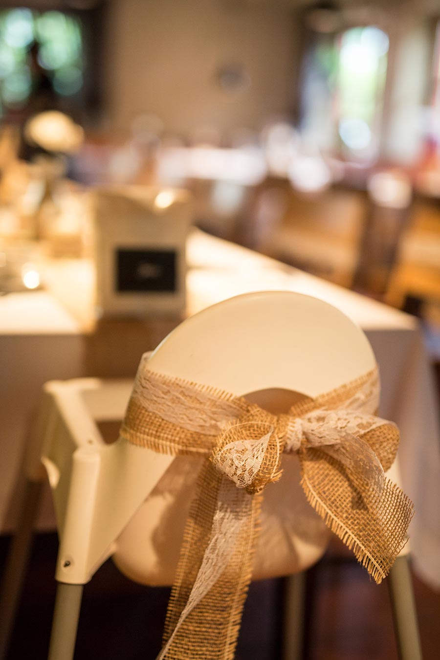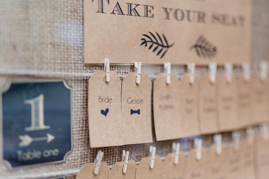 Nicht nur die ganze Dekoration und die Papeterie stammen vom Brautpaar selbst, sondern auch der komplette Sweet Table. Bei der Hochzeit gibt es so unglaublich viele Tolle Ideen zu entdecken, wie etwa der Sitzplan. Für den Sitzplan hat das Brautpaar ein Jute-Stoff als Hintergrund benutzt, vor dem mehrere Schnüre gespannt waren. Jede Schnur stand dabei für einen Tisch, an der kleine Kärtchen mit dem Namen aus Kraftpapier mit einer Klammer angebracht wurden. Dies passt perfekt zum Vintage-Stil.