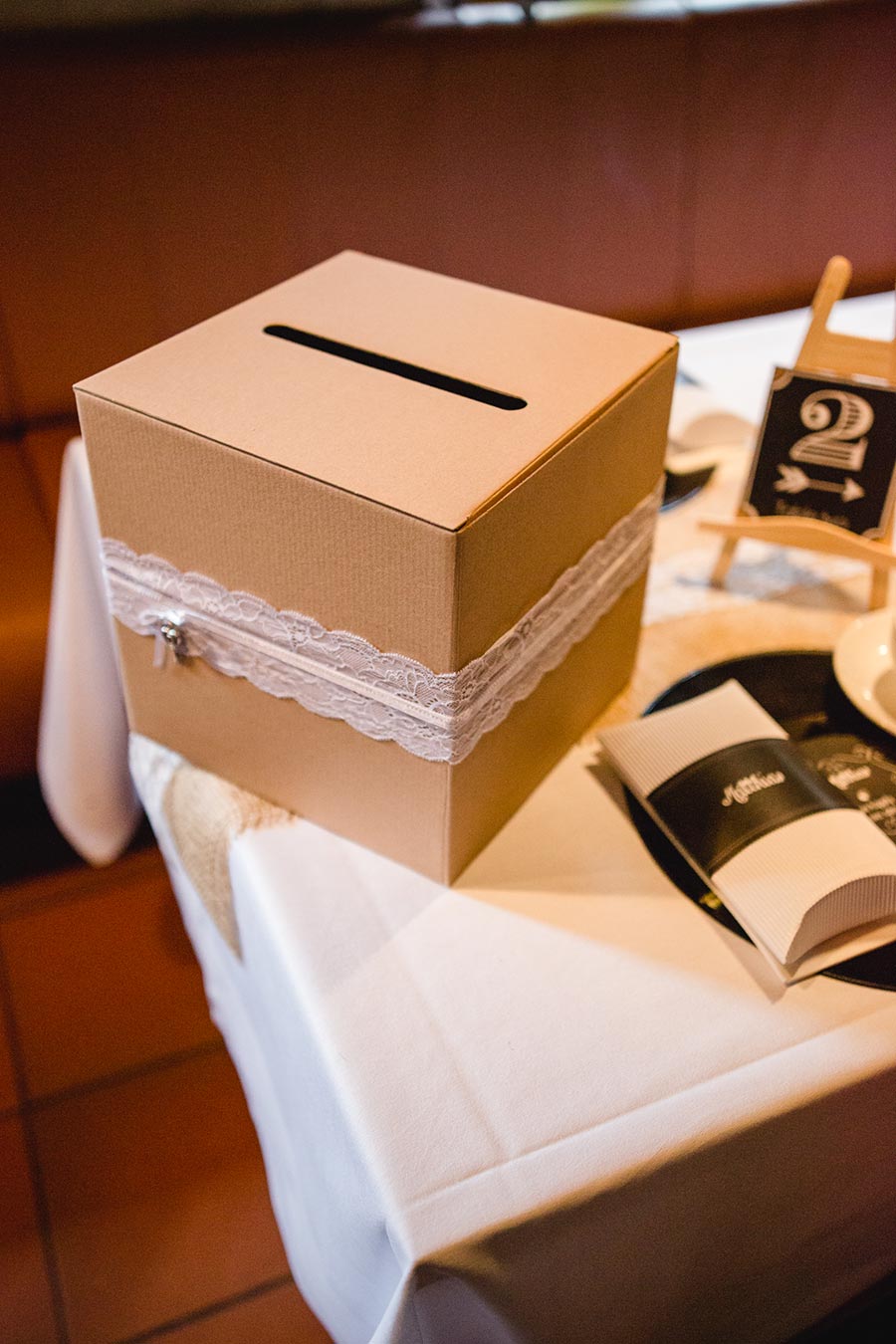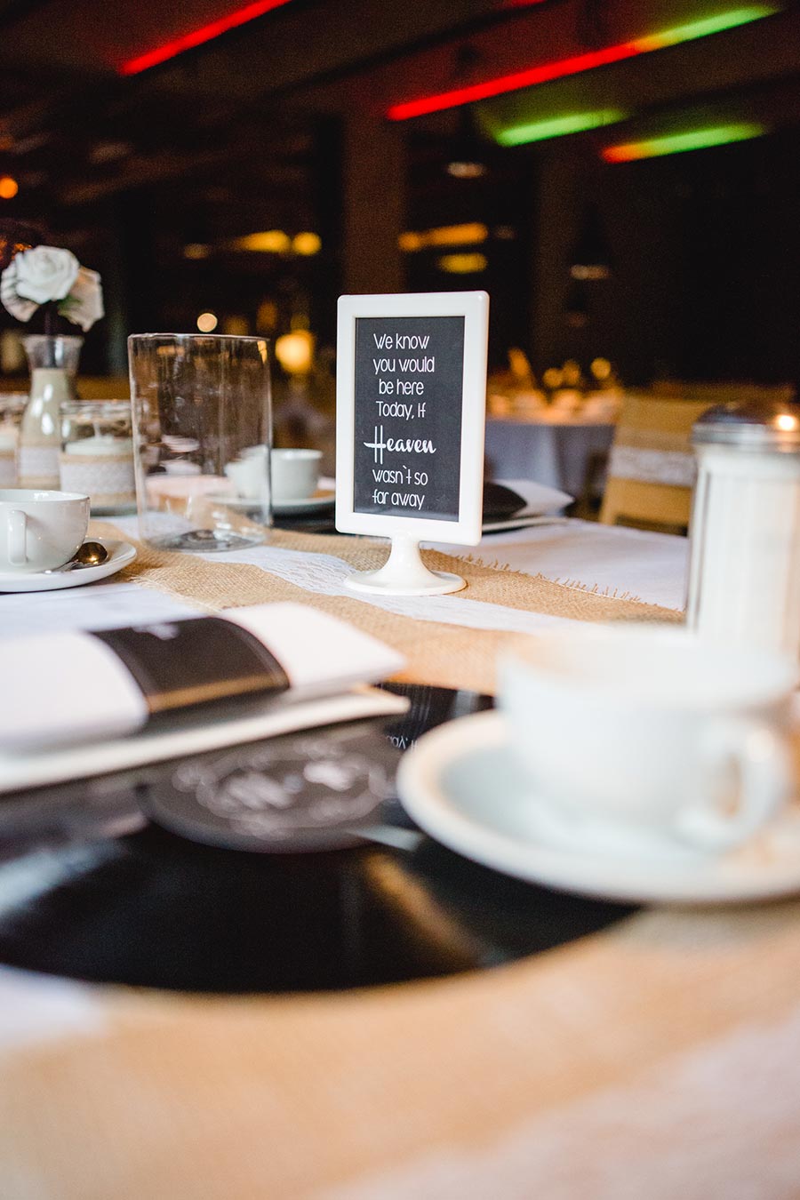 Auch bei der Tischdeko war das Brautpaar sehr kreativ, um den Rockabilly-Stil mit einzubringen. Dem Gast begrüßt nicht nur ein kleines Schächtelchen als Gastgeschenk, das gleichzeitig mit dem Namen als Platzkarte dient, sondern auch eine Schallplatte mit personalisiertem Label. Geniale Idee! Ob sich die Schallplatte wohl abspielen lässt?